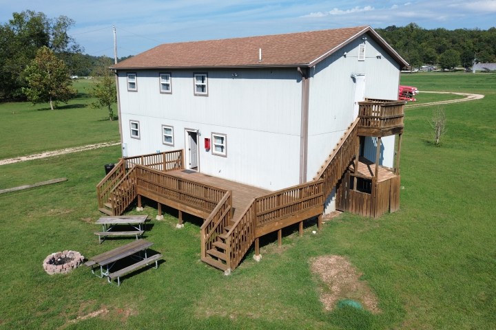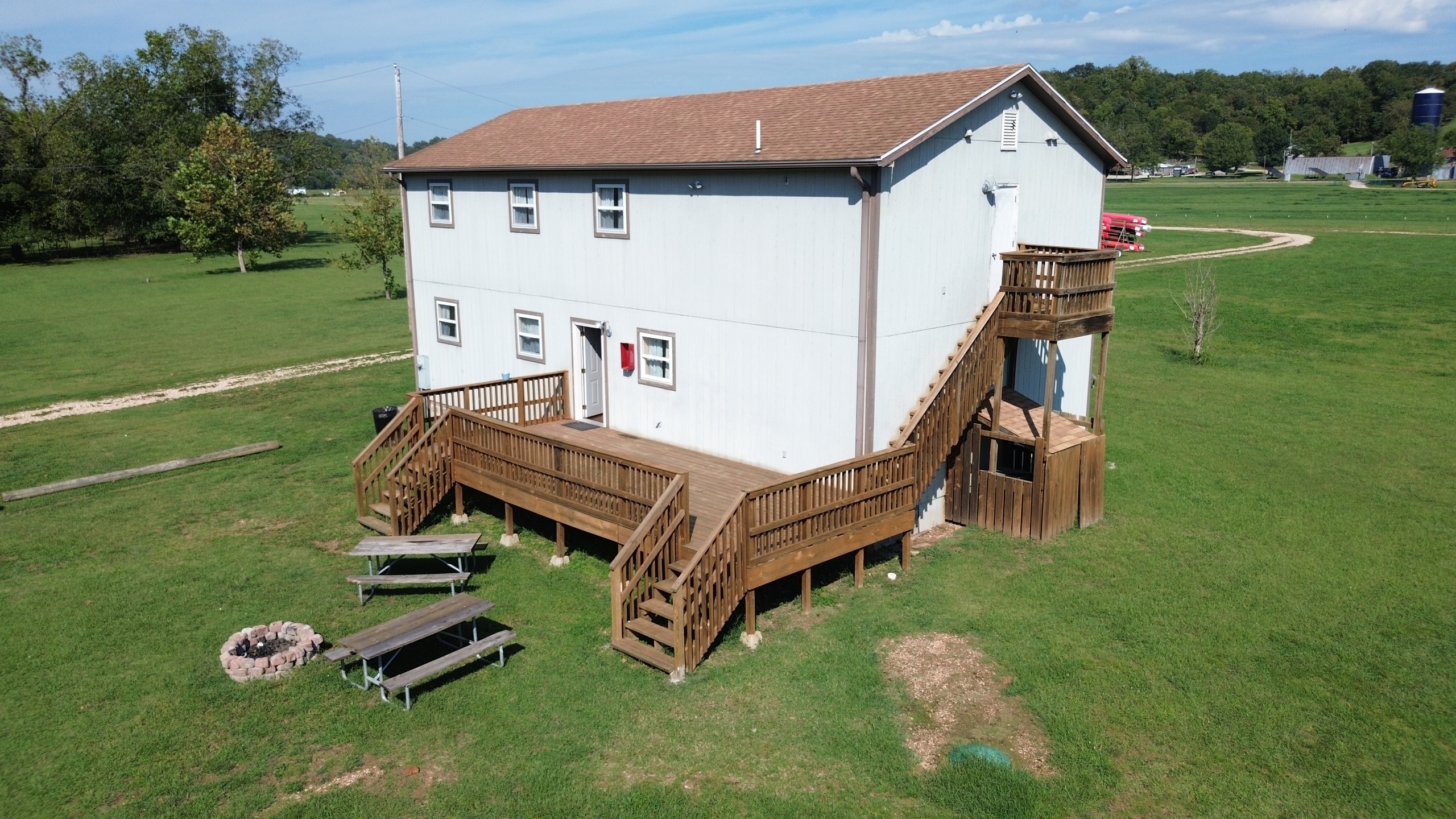 TWO River Run Lodges for rent on the Elk River, near the River House. Each of these River Run Lodges comes with a full deck looking towards the river, and include 8 individual bedrooms (2 rooms with queen beds downstairs and 6 rooms with full beds upstairs) as well as 4 bathrooms with two futons for additional sleeping accommodations. Each offers a full kitchen, as well, but you will need to bring your own kitchen supplies (pots and pans, dishware, utensils, etc.) These vacation home rentals sleep up to 20 people, be sure to bring all your personal items, including bedding, towels and other linens. We have also included central heat and air, as well as a firepit, large charcoal grill and picnic table.